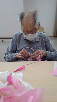 今回はお花紙と紐を使用し、しだれ桜の飾りを作りました。