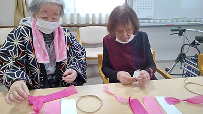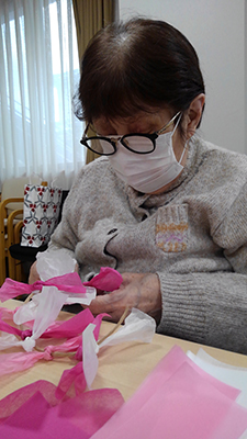 皆様からは、お花紙を折っていただき、折ったお花紙を紐に一つずつ巻き付けてもらいました。
